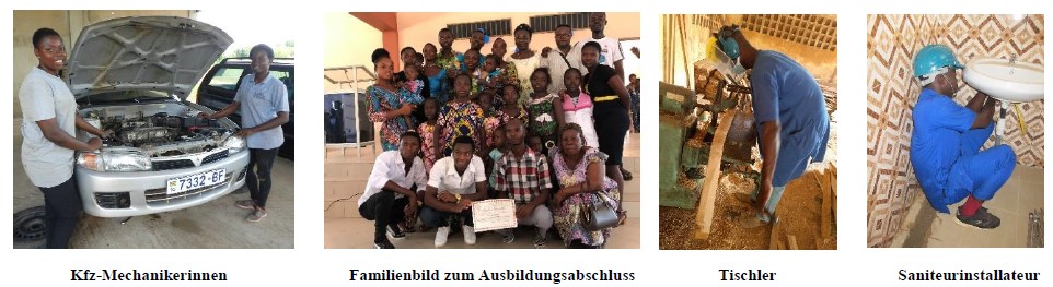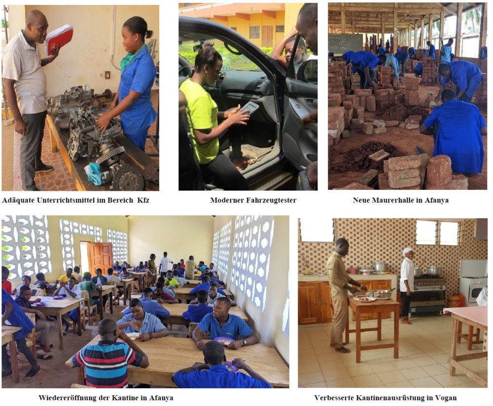 Mehr als 600 Auszubildende bereiten sich derzeit dort in einer 3-jähriger Ausbildung in 11 unterschiedlichen Berufen auf ihre Gesellenprüfung vor. In Afanya: Maurer, Tischler, Sekretariatsfachkräfte. In Vogan: Kfz-Mechaniker, Kfz-Elektriker, Karosserietechniker, Elektroinstallateure, Elektrotechniker, Informatiker, Alu-Tischler, Sanitärinstallateure: