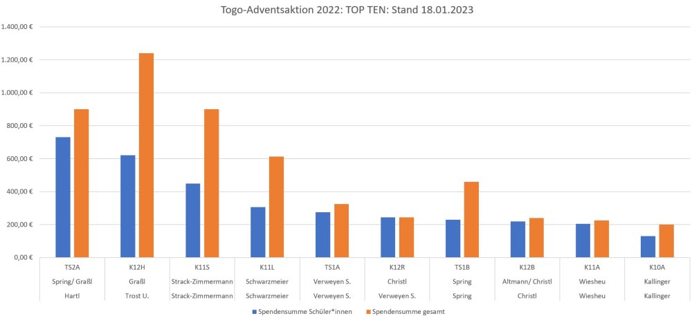 Im Dezember und vereinzelt noch im Januar stellten die Lehrerteams ihren Klassen die Partnerschulen mit Präsentationen, Bildern und Videos vor. Die Klassen spendeten dann, teilweise sehr großzügig zu Gunsten des Vereins „Freunde der Berufsschule Nazareth/Togo - Hilfe zur Selbsthilfe e.V.“, der das Geld direkt an die Partnerschulen weiterleitet. Es gab auch etwas zu gewinnen: Die drei Klassen mit den besten Ergebnissen erhalten eine Brotzeit für die ganze Klasse während der Unterrichtszeit.