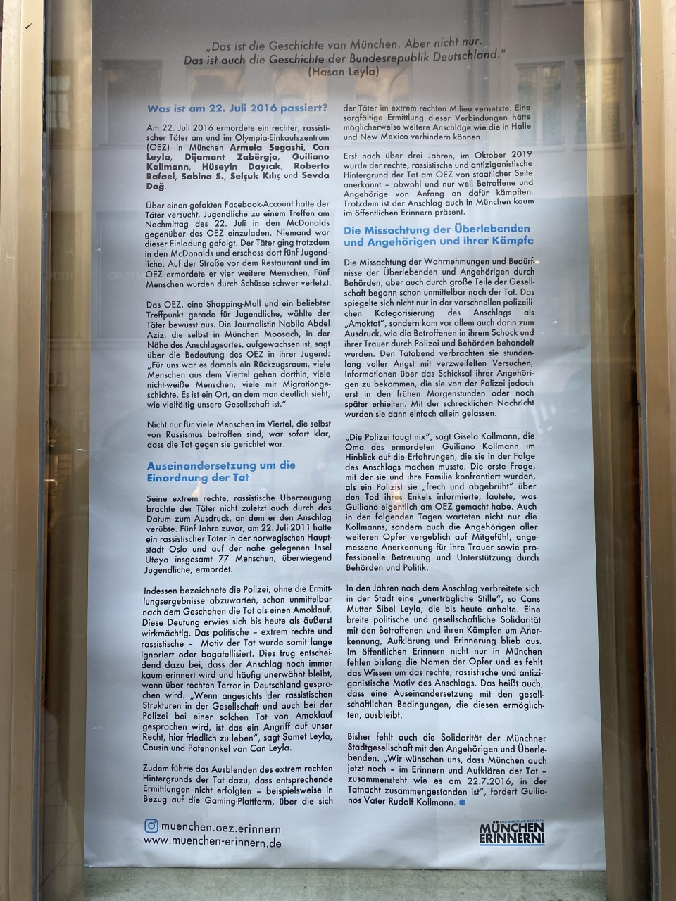 Bei dem rechtsradikal motivierten Anschlag in München tötete ein 18-jähriger Deutsch-Iraner am 22. Juli 2016 am und im Olympia-Einkaufszentrum im Stadtbezirk Moosach neun Menschen. Fünf weitere Personen wurden durch Schüsse verletzt. Sieben der neun Todesopfer waren Muslime, eines war ein Rom, ein weiteres Opfer ein Sinto.