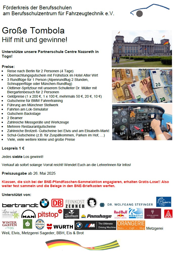 Auch unser Kantinenwirt Elvis steuerte zahlreiche Brotzeit-Gutscheine bei. Last but not least sind die Mitglieder, Unterstützer und befreundeten Firmen des Vereins „Freunde der Berufsschulen Centre Nazareth/Togo Hilfe zur Selbsthilfe e.V.“ zu nennen, die tolle Preise sammelten, herrichteten und Gutscheine stifteten!